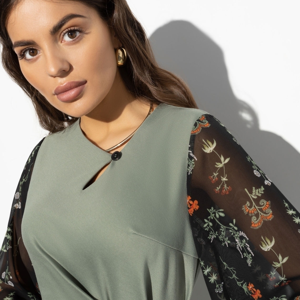 Состав: Трикотаж «милано», «шифон» (65% п/э, 30% вискоза, 5% спандекс)