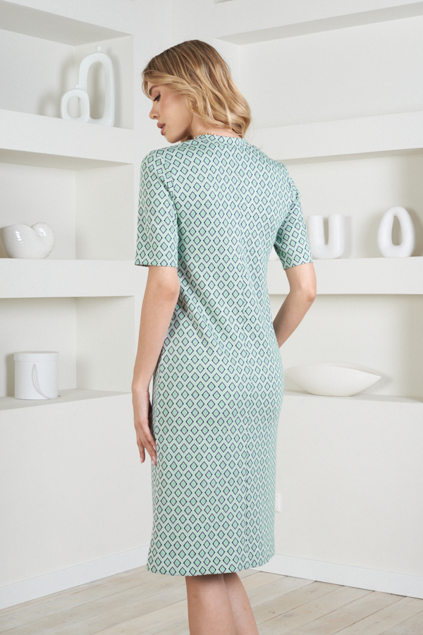 Платье полуприлегающего силуэта из эластичного полотна с жаккардовым узором. Втачной короткий рукав. V-образный вырез горловины, оформлен бейкой и украшен пуговицами.