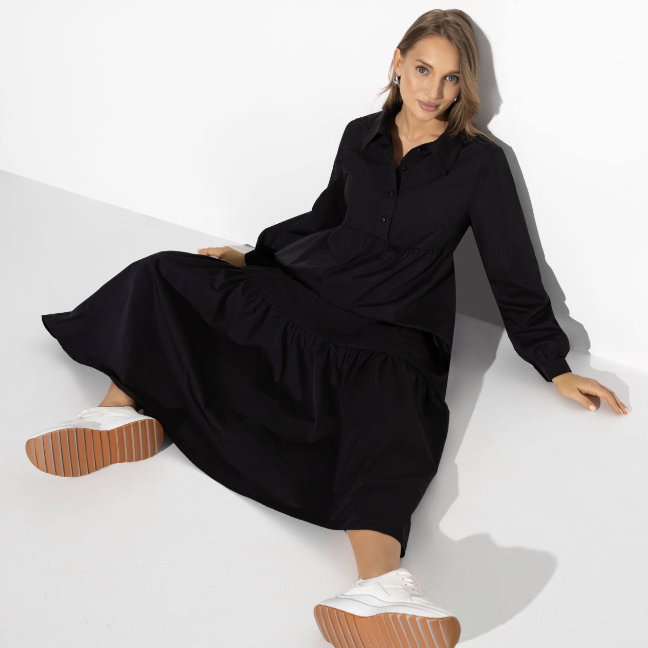 Станьте королевой монохрома в платье черного цвета. Однотонные образы представляют на подиумах CHLOE, LOEWE, PRADA. Объемный тотал лук дополните аксессуарами для создания фактурности.