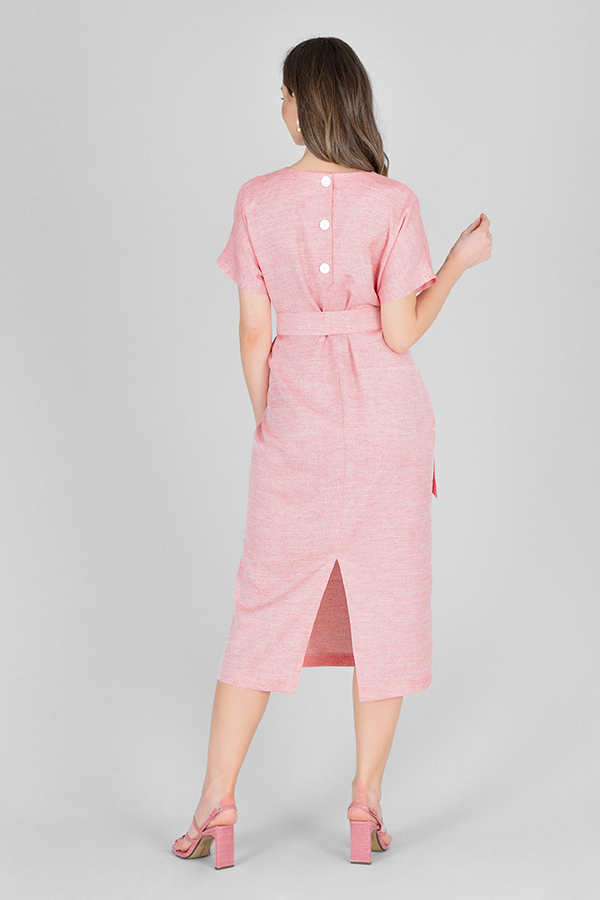 Платье из меланжевой плательной ткани в диагональный рубчик. Свободный силуэт, слегка прилегающий в области бедра. По спинке изделия выполнена застёжка на декоративные пуговицы, снизу-разрез. Цельнокроеный короткий рукав. Круглый вырез горловины. В комплекте пояс, позволяющий создавать приталенный силуэт.