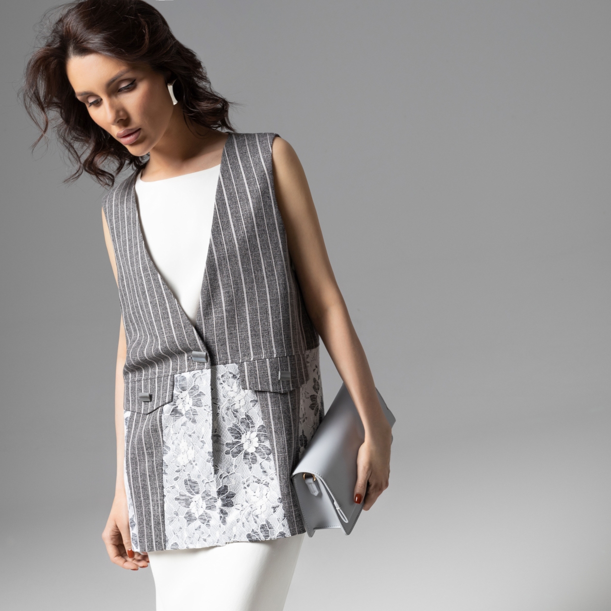 «Искусство переговоров» – это диалог формы, фактуры и намёков. Удлинённый силуэт, нежное кружево и безупречный серый создают образ, где женственность и уверенность идут рука об руку. Жилет прямого кроя. Дополнен кружевом первоклассного качества. Эксклюзивная фурнитура. Имитация карманов. Есть подклад.