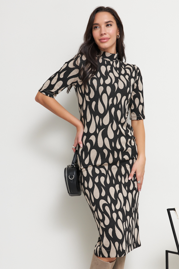 Платье полуприлегающего силуэта из эластичного полотна с жаккардовым узором. Вырез горловины оформлен воротником-стойкой. Рукав втачной.