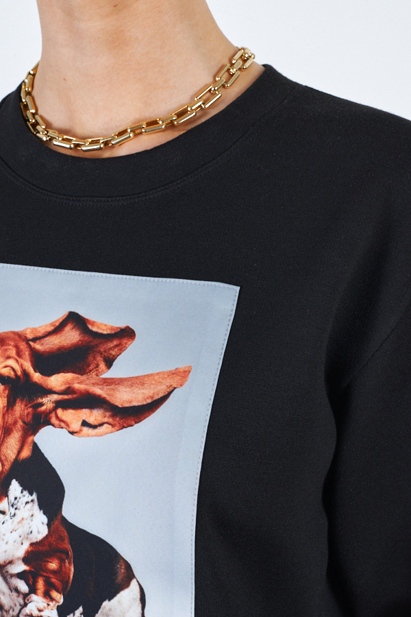 Джемпер свободного силуэта из эластичного полотна. Короткий втачной рукав в спущенную пройму. Вырез горловины оформлен бейкой. На передней части изделия выполнена аппликация.