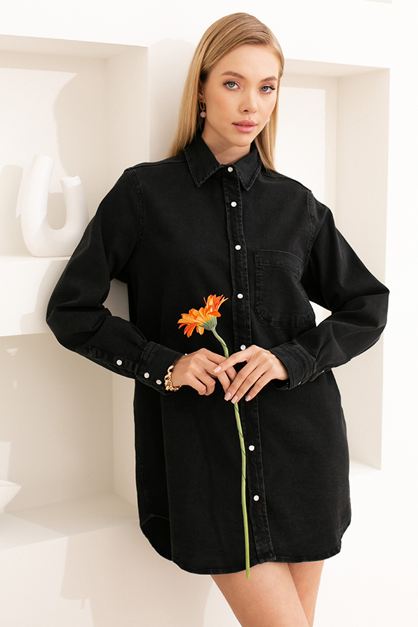 Платье-рубашка прямого свободного кроя из классического денима, выполнена по классической джинсовой технологии (варка с эффектом легкого выбеливания). Рубашечный воротник, накладной карман, застежка на кнопки с керамическим декором. Рукав втачной с манжетой. Швы оформлены декоративными строчками. Длина изделия позволяет его носить как самостятельное платье, так и в комплекте с брюками. Изделие очень свободного кроя. Любителя более плотной посадки рекомендуем брать на размер меньше.
