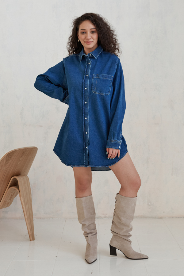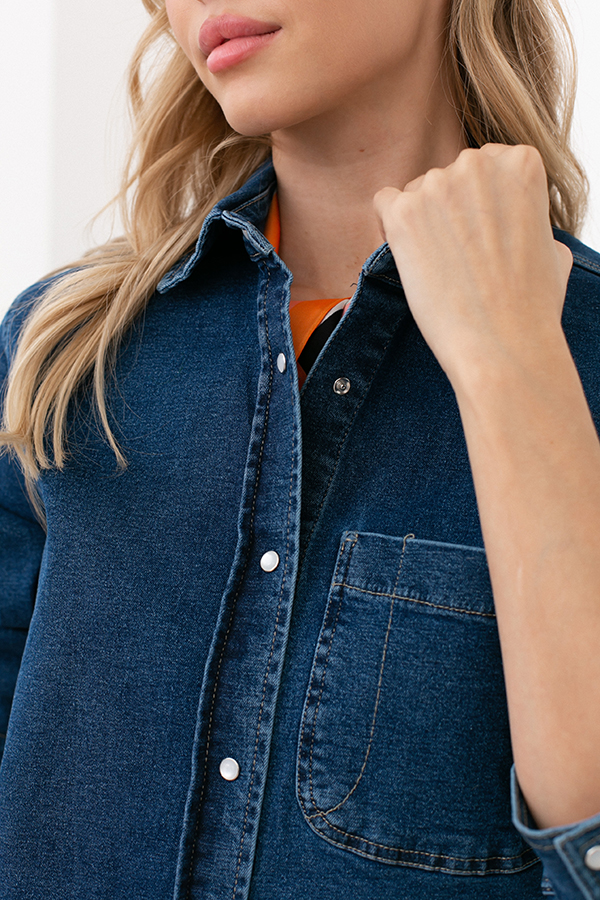 Платье-рубашка прямого свободного кроя из классического деним, выполнена по классической джинсовой технологии (варка с эффектом легкого выбеливания). Рубашечный воротник, накладной карман, застежка на кнопки с керамическим декором. Рукав втачной с манжетой. Швы оформлены декоративными строчками. Длина изделия позволяет его носить как самостятельное платье, так и в комплекте с брюками. Изделие очень свободного кроя. Любителя более плотной посадки рекомендуем брать на размер меньше.