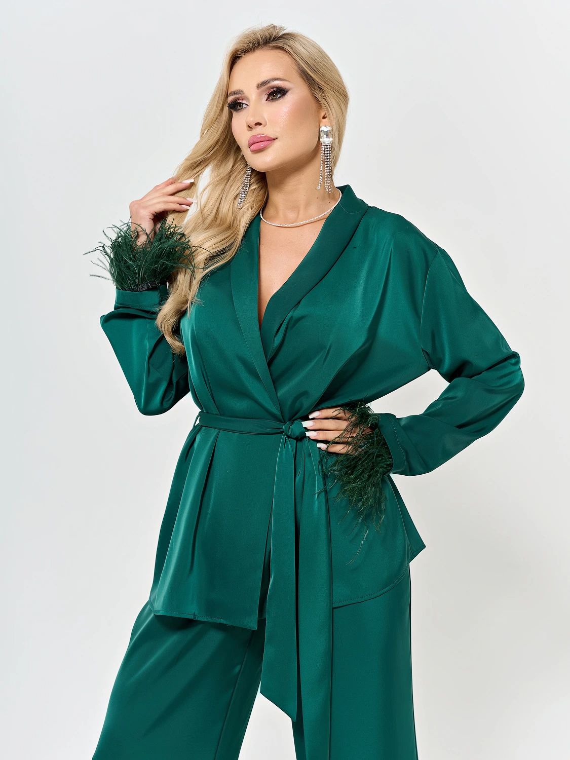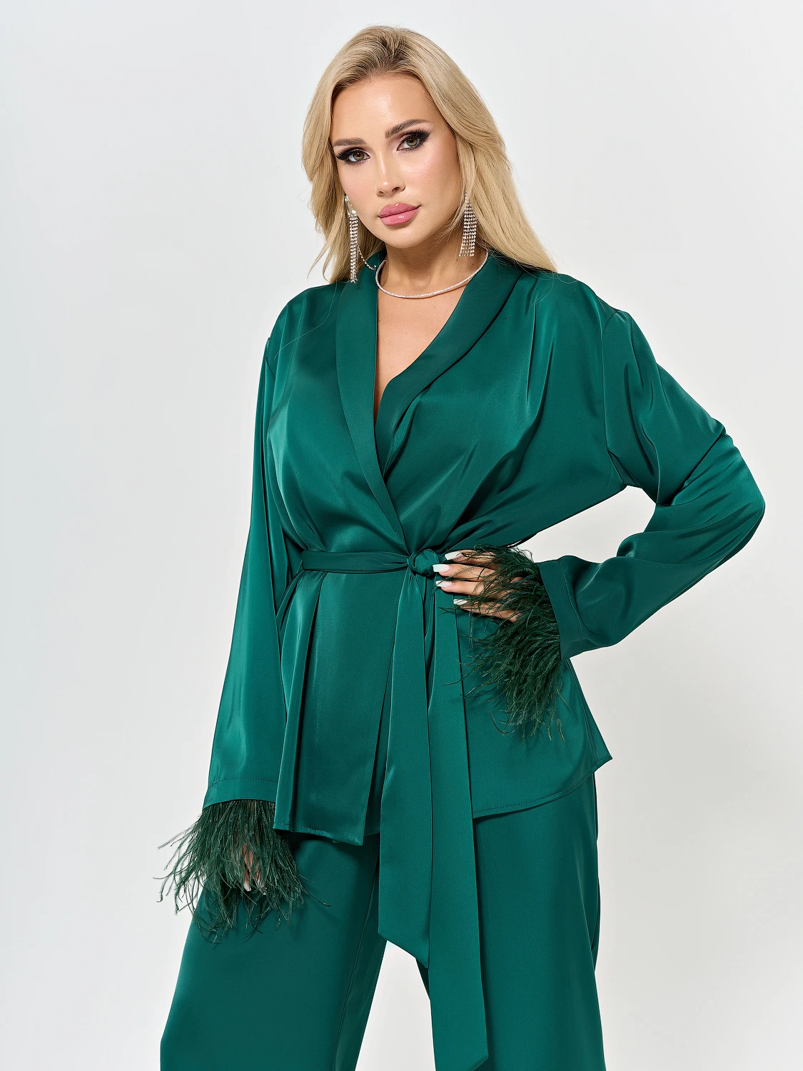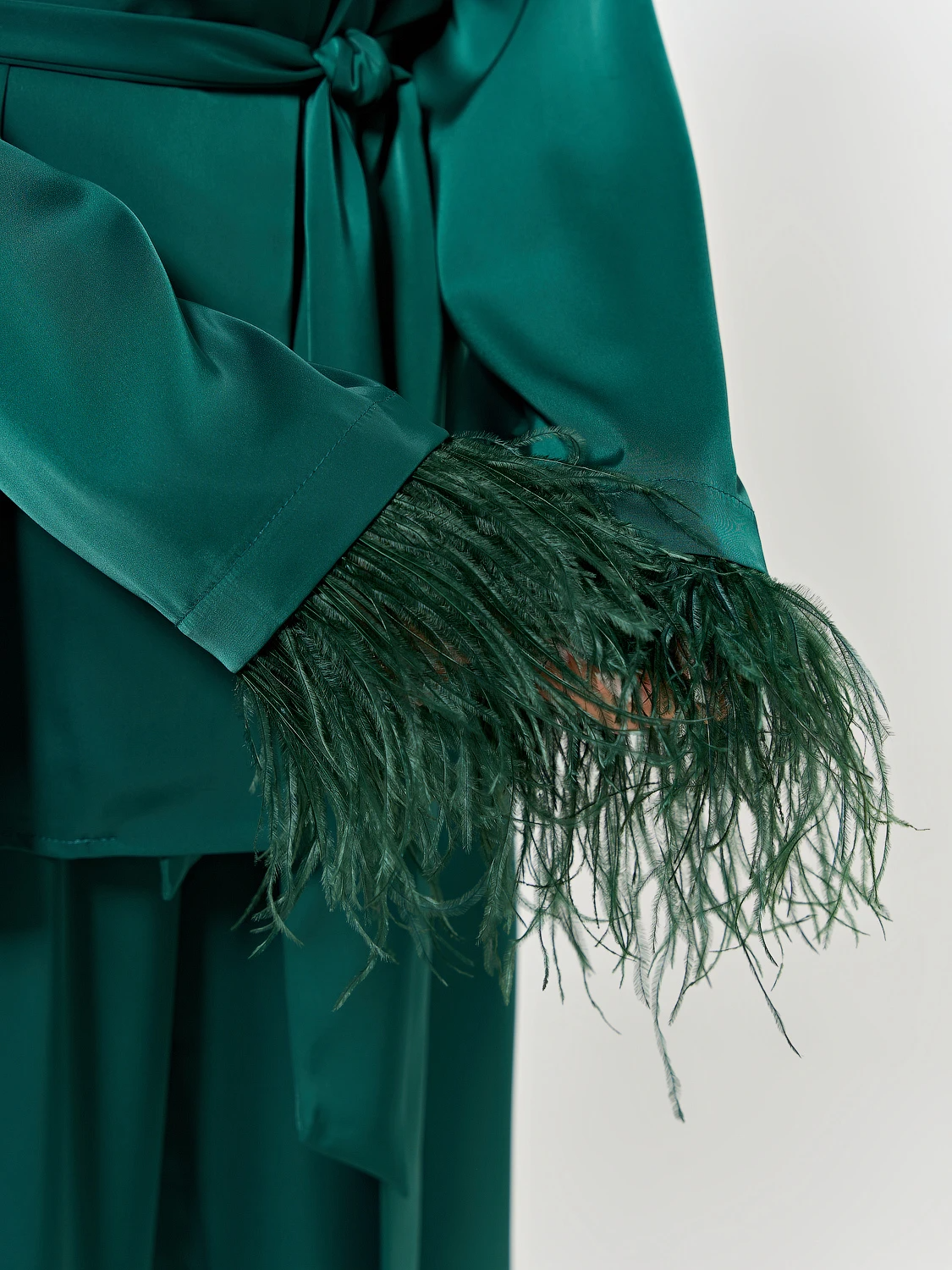 Низ рукавов декорирован съемной бахромой из перьев.