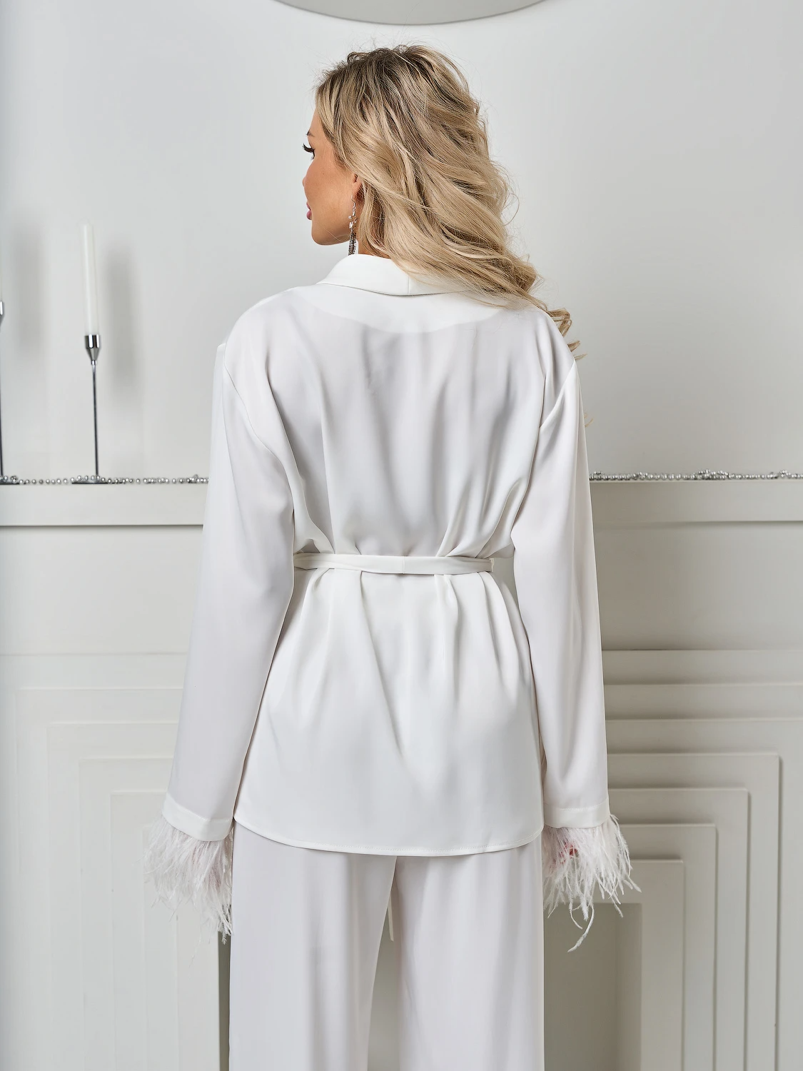 Низ рукавов декорирован съемной бахромой из перьев.