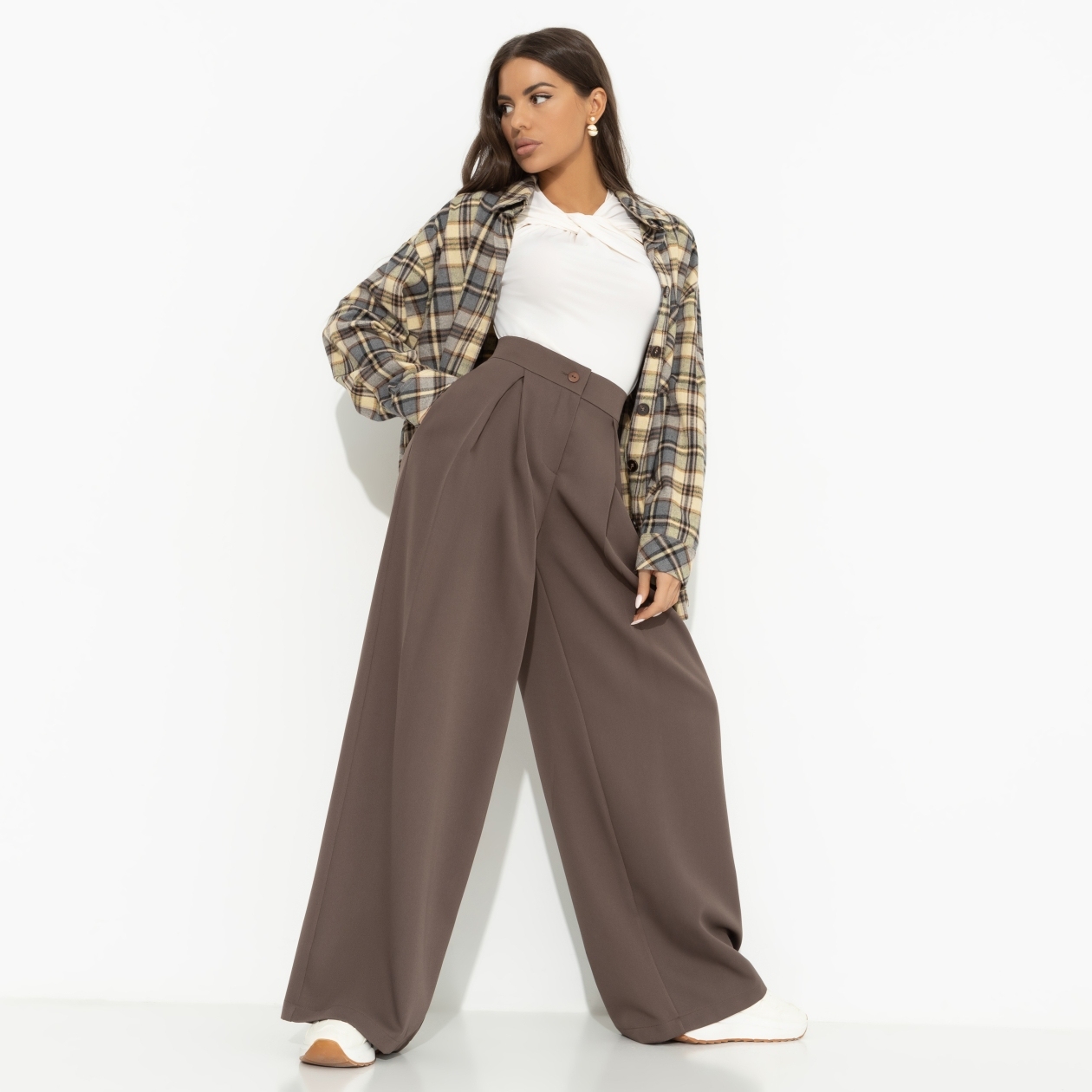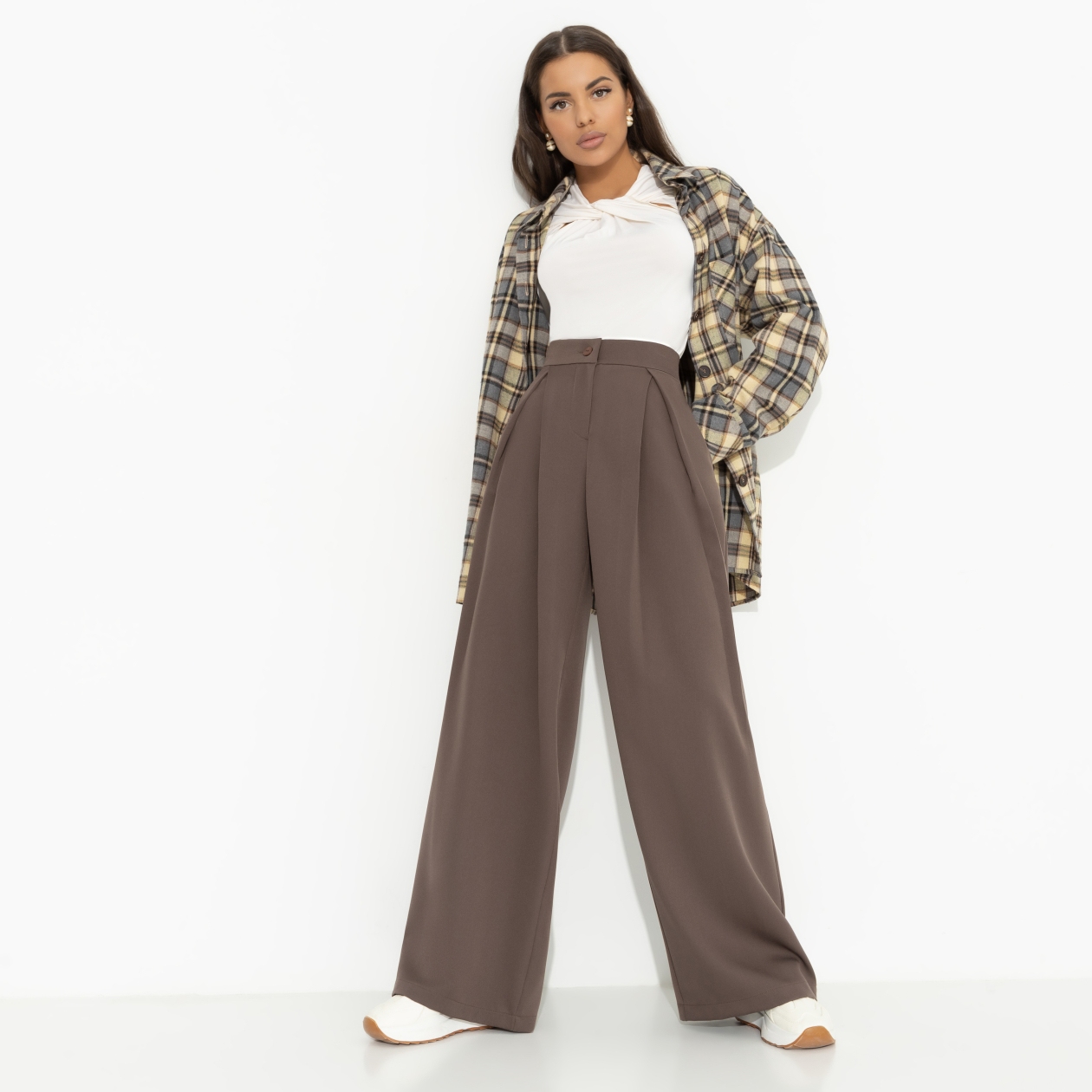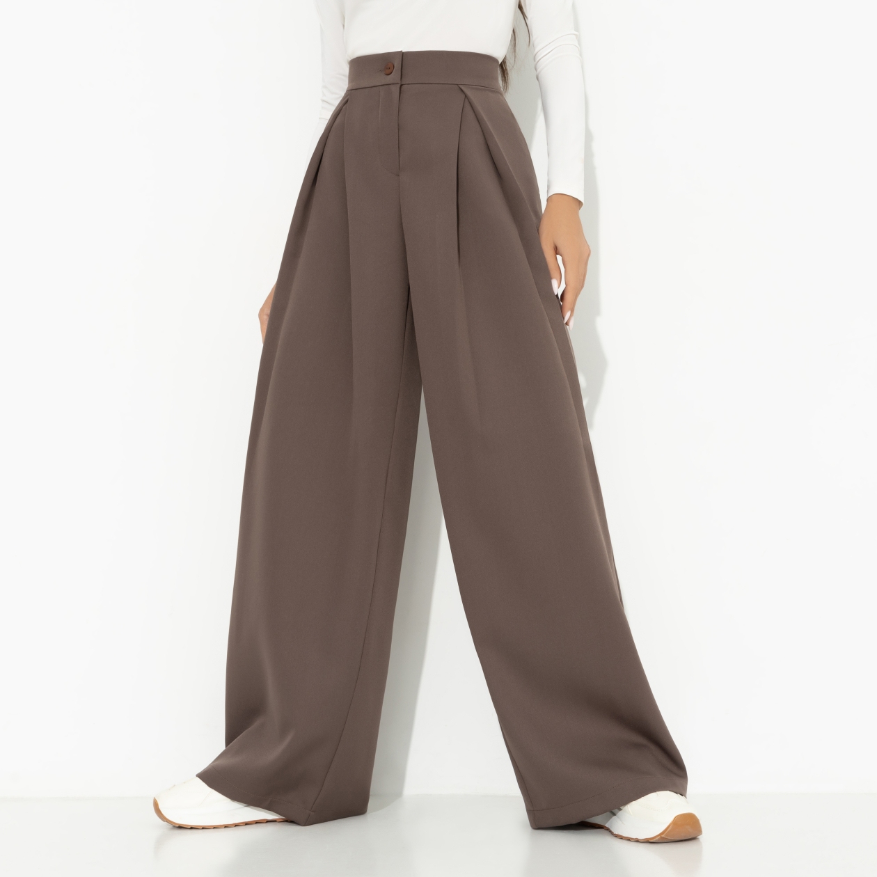 Цвет – какао с кокосовым молоком. Густой и глубокий, он не может не обратить на себя внимания. Брюки CHARUTTI подчеркнут вашу хрупкость и высокое чувство стиля. Миксуйте с водолазками, футболками, топами или рубашками. Брюки широкие. Посадка высокая, на талии. Юбки застегивается на молнию и пуговицу. Есть защипы, Изделие с карманами.