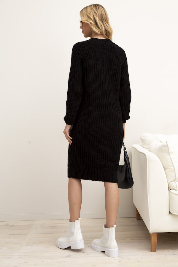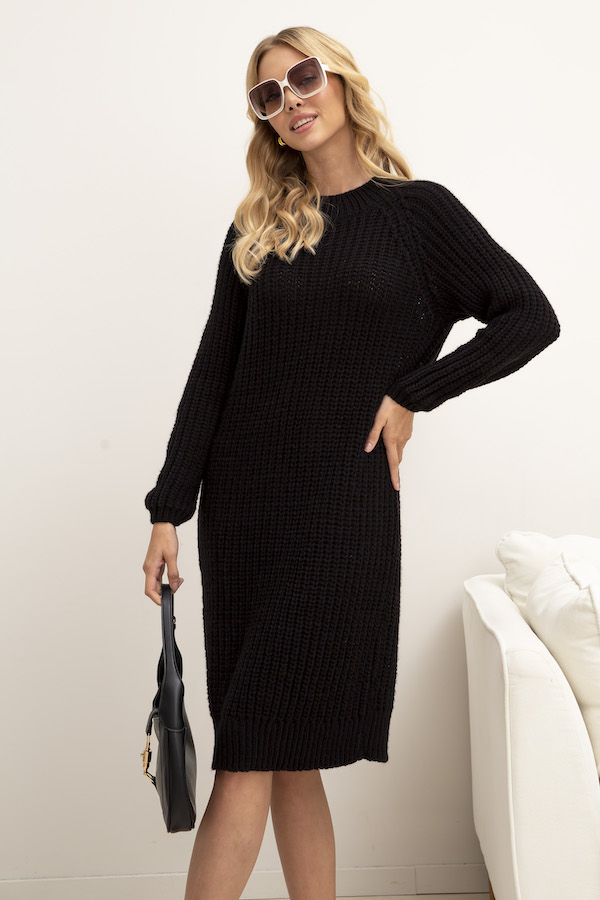 Платье из мягкого фактурного полотна. Длинный рукав-реглан. Низ изделия, рукава и горловина обработаны резинкой. Изделие выполнено из объемной пряжи.