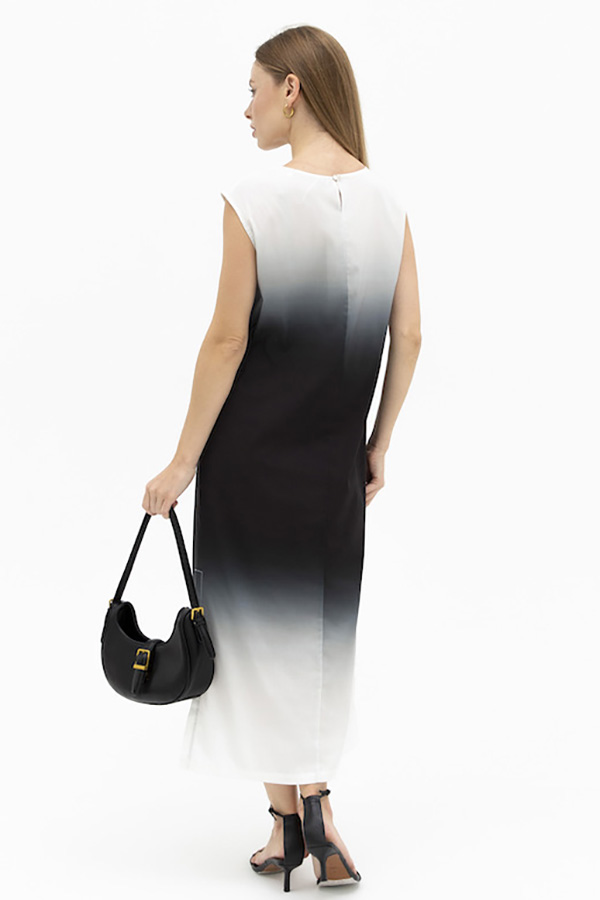 Платье из вискозной плательной ткани. Полуприлегающий силуэт, с разрезом в боковом шве. Круглый вырез горловины. По среднему шву спинки застёжка на петлю-пуговицу.