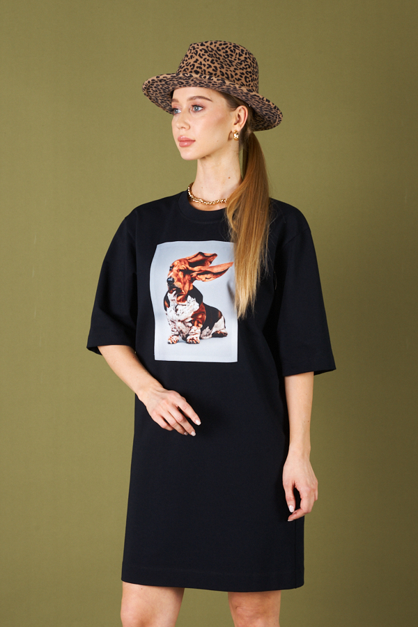 Платье свободного силуэта из футера. Короткий втачной рукав в спущенную пройму. Вырез горловины оформлен бейкой. На передней части изделия выполнена аппликация.