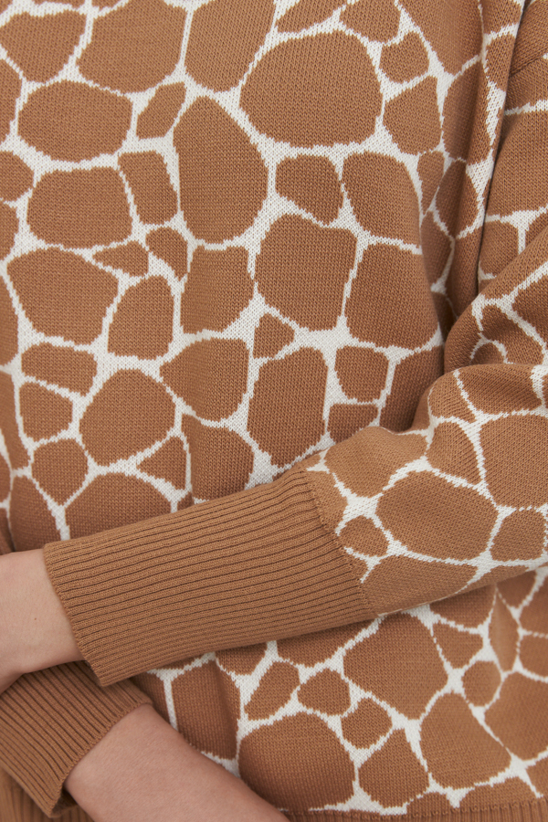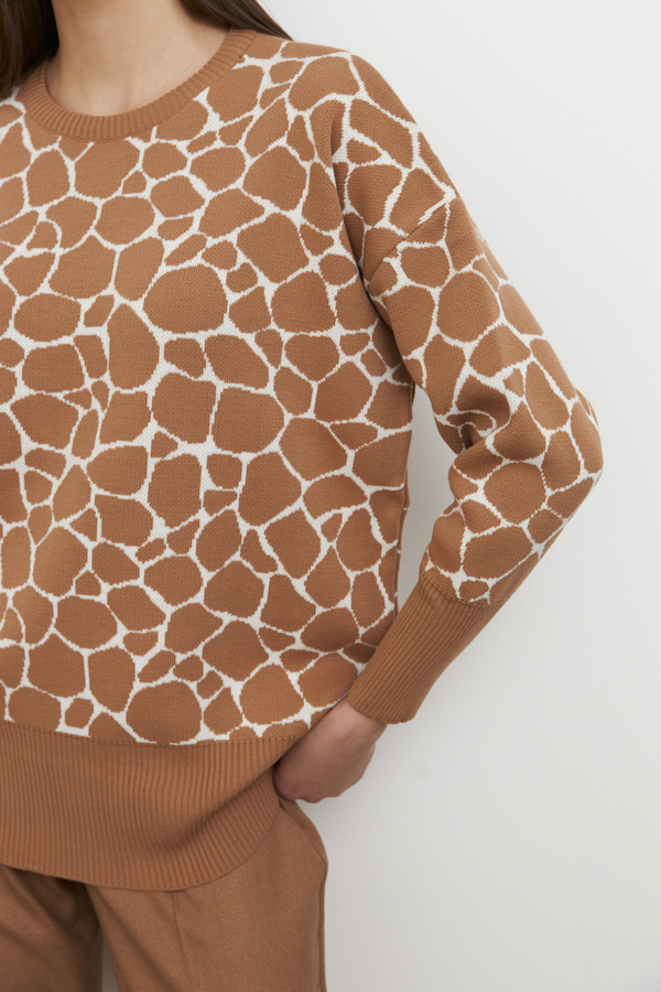 Джемпер свободного силуэта со спущенной линией плеча и длинным рукавом. Круглый вырез горловины оформлен резинкой, низ изделия и низ рукава-высокой резинкой. Изделие выполнено из мягкой структурированной пряжи.