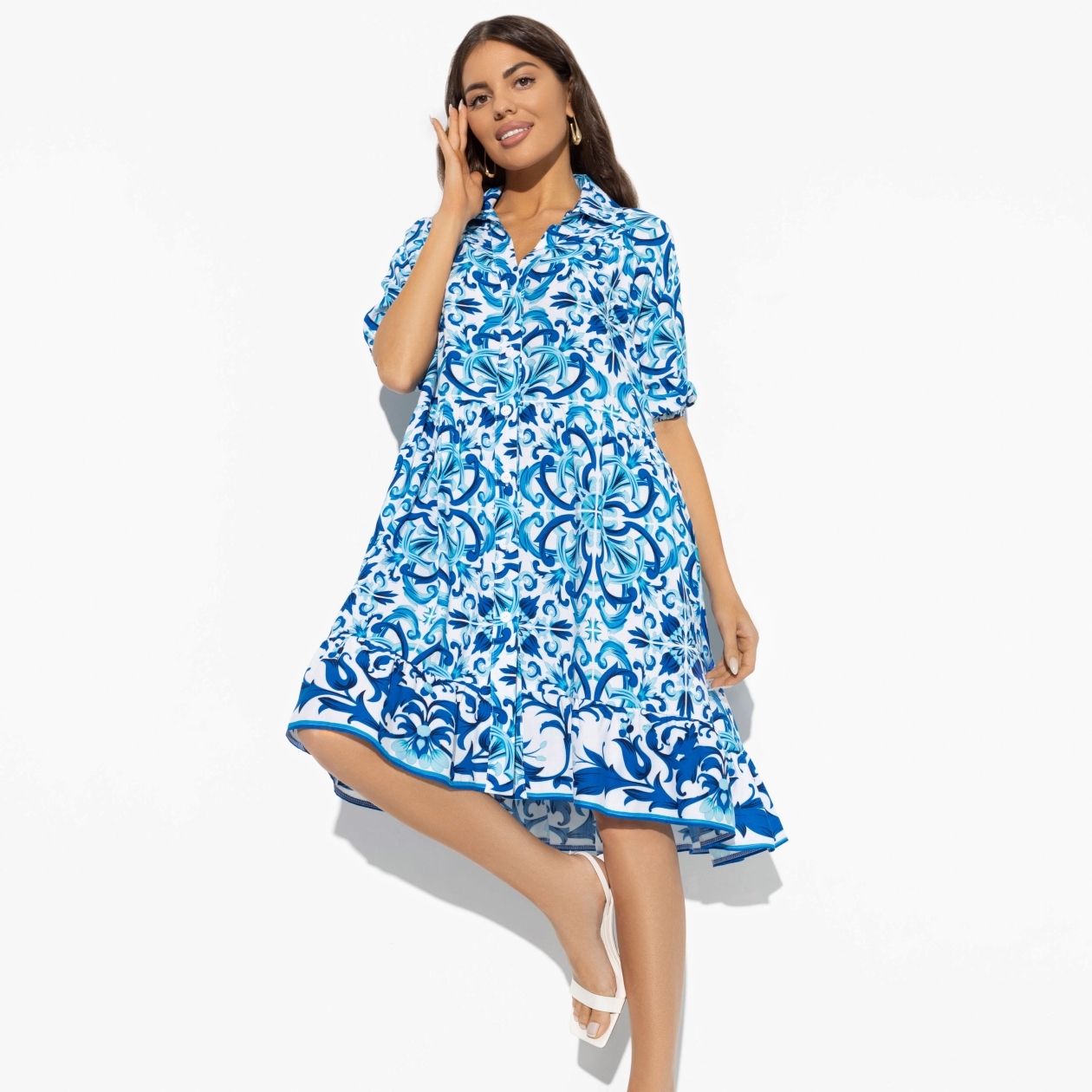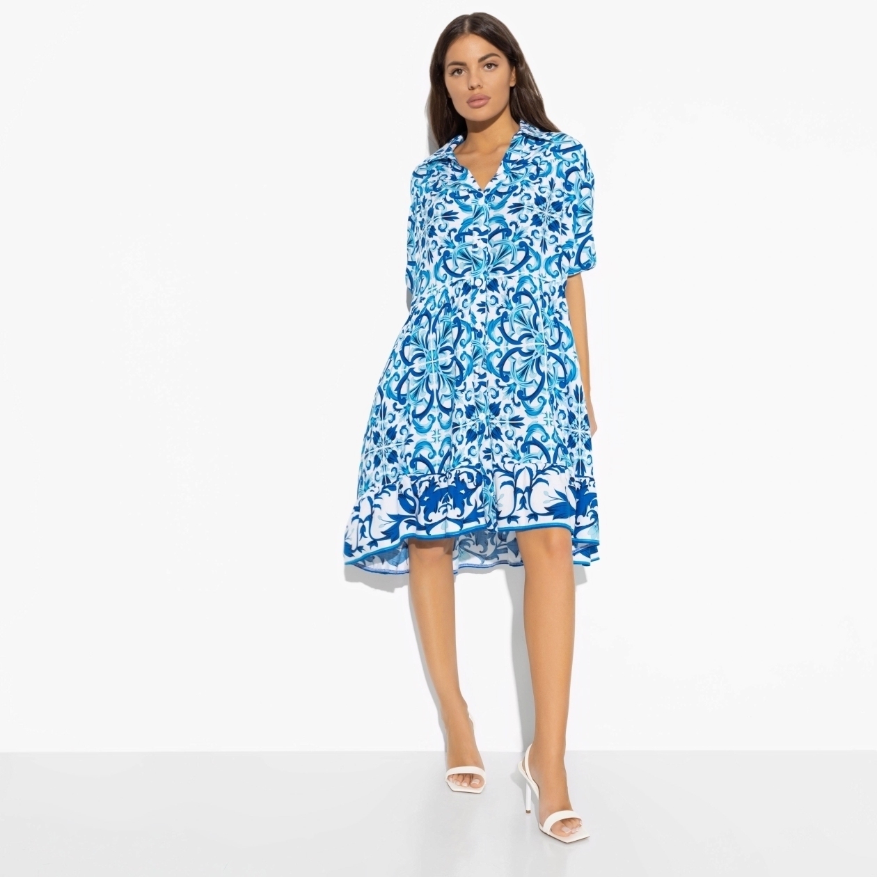 Длина платья чуть выше колена подходит для среднего роста, а свободная посадка обеспечивает комфорт и подходит для любой фигуры. Легкие воланы по подолу платья добавляют игривости и женственности, создавая воздушный и романтичный образ. Рукав до середины плеча и пуговицы по всей длине платья придают ему дополнительную элегантность и стиль.