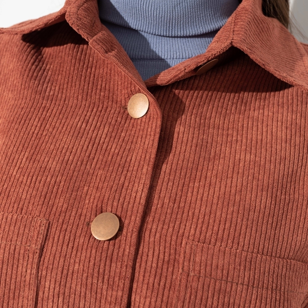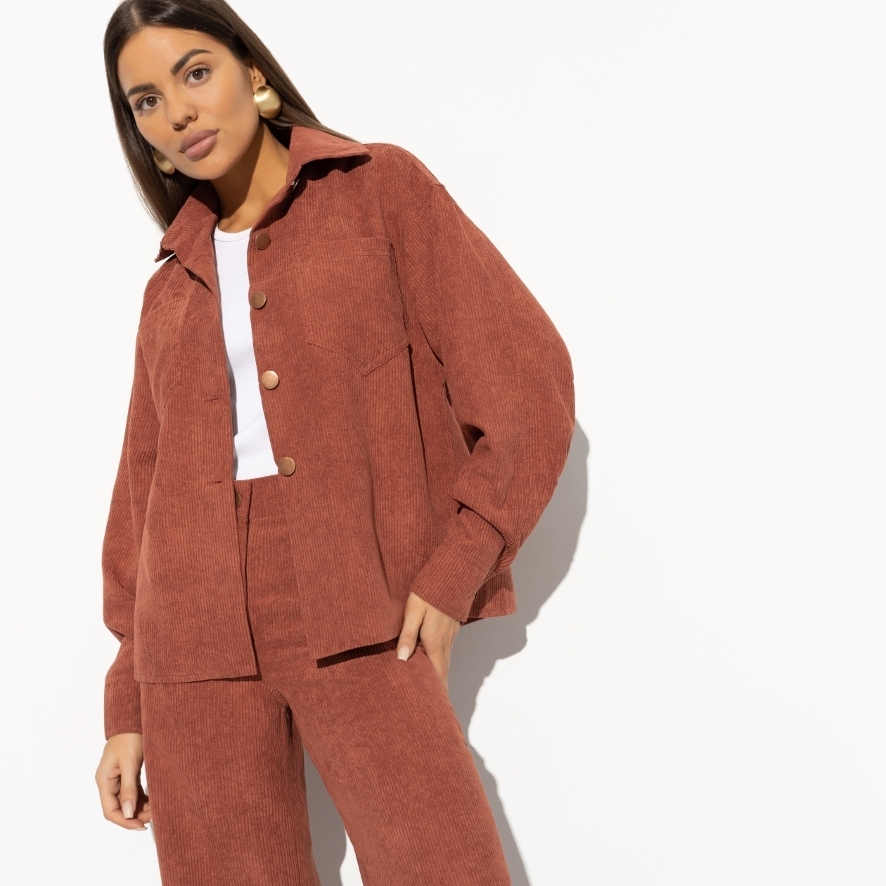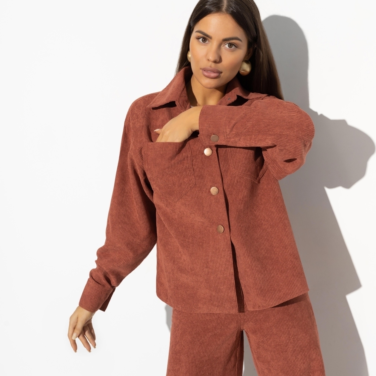 Ты добавила в свое резюме пункты о том, что стильно выглядишь и широко улыбаешься. И сразу получила несколько выгодных предложений! Это ценность мягких навыков. На собеседование надевай рубашку CHARUTTI в терракотовом цвете. Свободный крой, есть карманы. Застегивается на пуговицы. Превосходный вельвет!