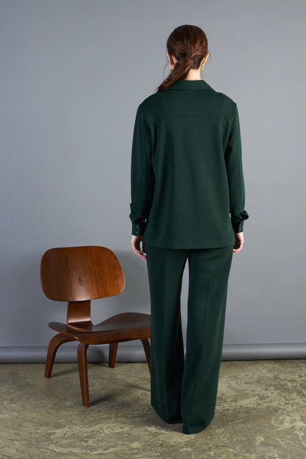 Брюки выполнены из эластичного полотна. Брюки прямого силуэта. Пояс притачной с эластичной резиной. На передней части брюк застрочены стрелки.