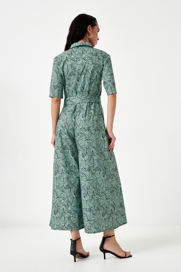 Стильный комбинезон из комфортной вискозной ткани. Свободный силуэт с застёжкой на пуговицы, в боковых швах карманы. Втачной короткий рукав. Вырез горловины обработан отложным воротником на стойке. Изделие с заниженной линией сидения обеспечивает комфортное движение. В комплекте пояс из основной ткани.