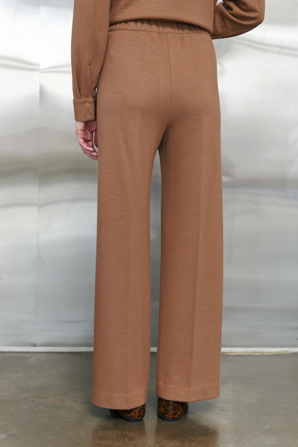 Брюки прямого силуэта из эластичного полотна. Пояс притачной с эластичной резиной. На передней части брюк застрочены стрелки.