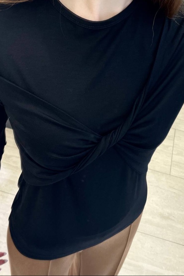 Джемпер из вискозного эластичного полотна прилегающего силуэта. Изделие оригинального кроя с перекрутом в области груди. Круглый вырез горловины окантован эластичной бейкой. Втачной длинный рукав.