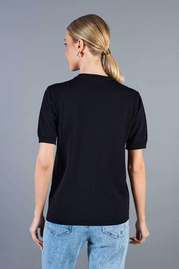 Джемпер прямого силуэта. Короткий втачной рукав. Круглый вырез горловины, низ изделия и низ рукава оформлены резинкой. Изделие выполнено из мягкой вискозной пряжи.