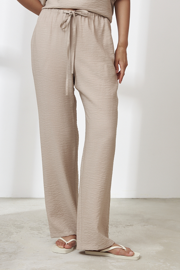 Брюки прямого силуэта из вискозной ткани с крэш-эффектом. Пояс с эластичной резиной и кулиской, в боковых швах карманы.