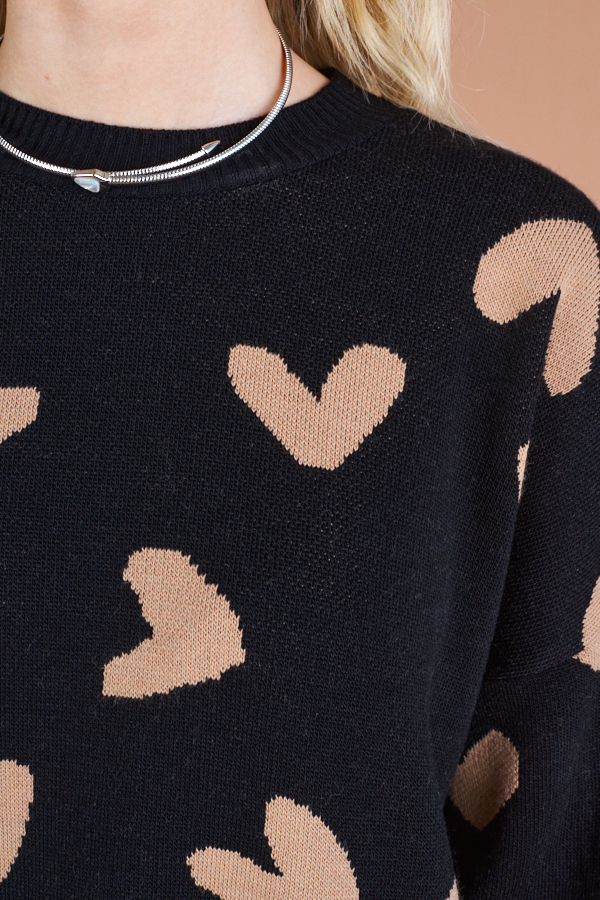 Платье свободного силуэта с узором «сердечки» на передней части. Изделие со спущенной линией плеча и длинным рукавом. Низ изделия и низ рукава с высокой резинкой. Круглый вырез горловины оформлен резинкой-бейкой. Изделие выполнено из мягкой структурированной пряжи.