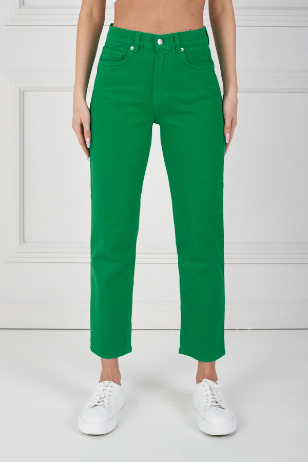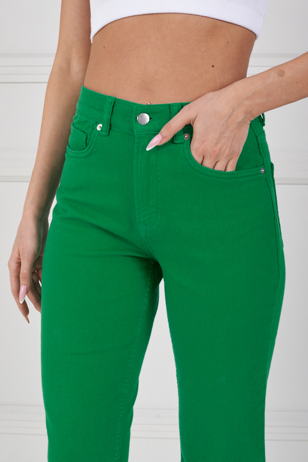 Брюки из эластичного денима, чуть зауженные книзу. На задней части брюк выполнены накладные карманы, на передней - карманы с подкройным бочком. Притачной пояс со шлёвками. Застёжка на молнию-гульфик и пуговицу.