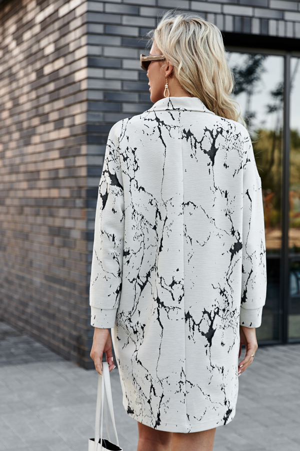 Платье из фактурного эластичного полотна. Силуэт прямой, свободный. Рукав втачной в спущенную пройму, с манжетой. Воротник-стойка. На передней части изделия застежка-молния.