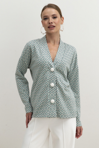 Платье свободного силуэта из плательной ткани. По центру передней части изделия выполнен шов. Цельнокроеная стойка, переходящая в V-образный вырез горловины, визуально делает фигуру стройнее. Втачной короткий рукав.