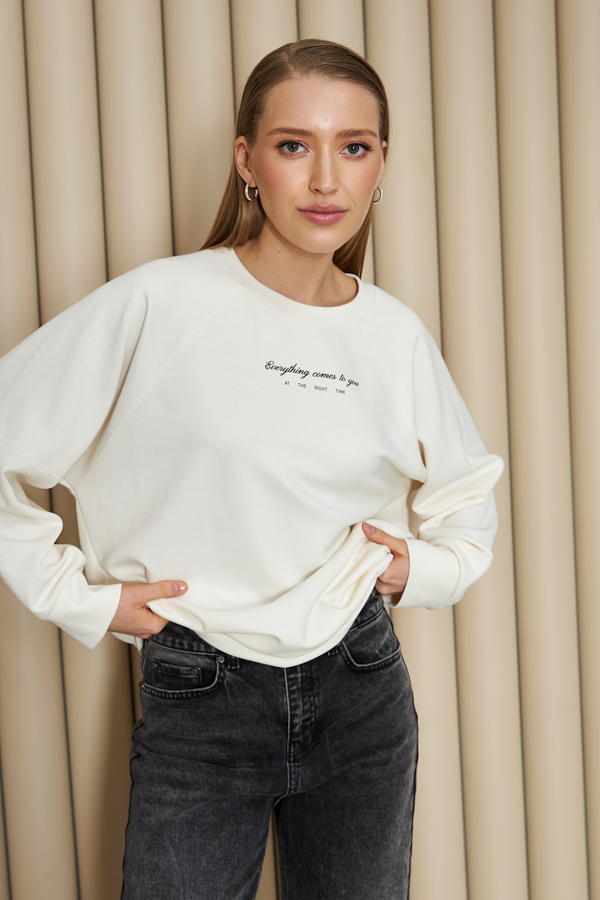 Свитшот свободного силуэта из эластичного полотна. Круглый вырез горловины оформлен бейкой. Рукав реглан с горизонтальным швом в области локтевого сгиба. По низу изделия и рукавов выполнены притачной пояс и манжеты из основной ткани. В таблице размеров представлены параметры человека, а не изделия.