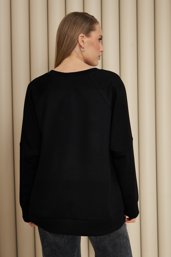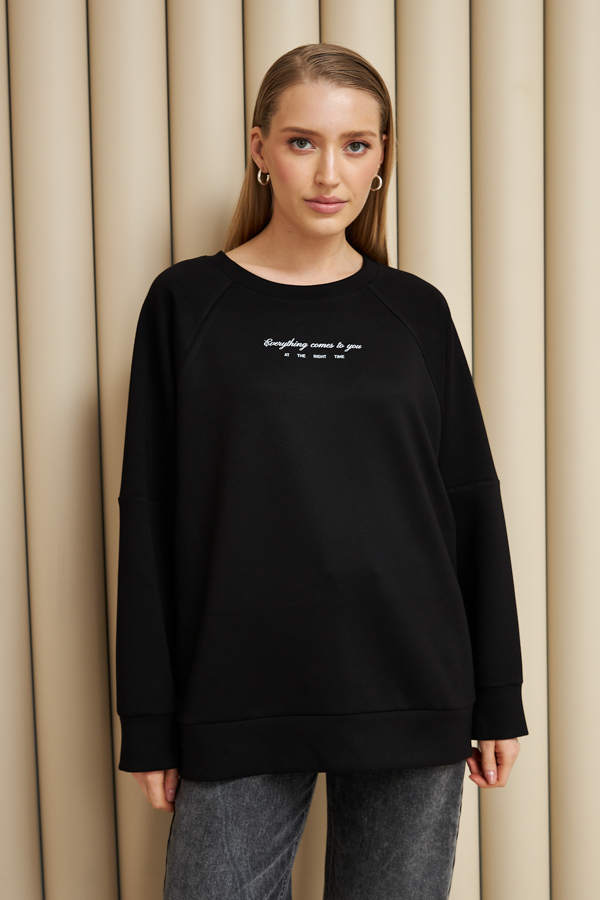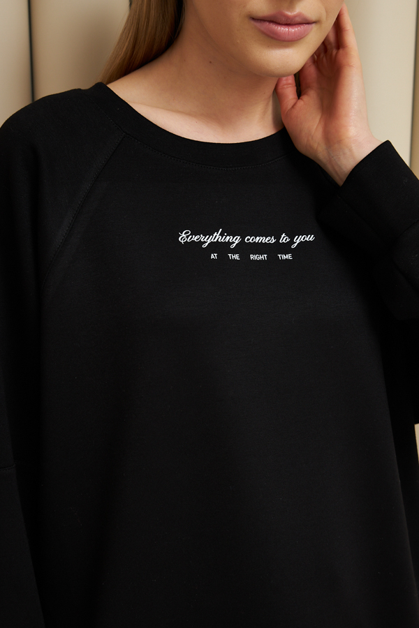 Свитшот свободного силуэта из эластичного полотна. Круглый вырез горловины оформлен бейкой. Рукав реглан с горизонтальным швом в области локтевого сгиба. По низу изделия и рукавов выполнены притачной пояс и манжеты из основной ткани. В таблице размеров представлены параметры человека, а не изделия.