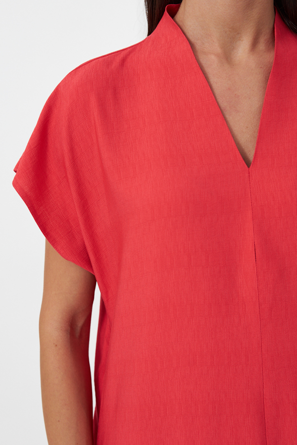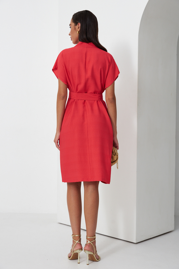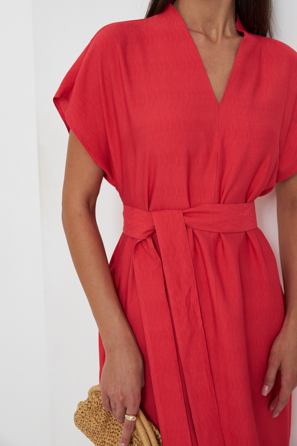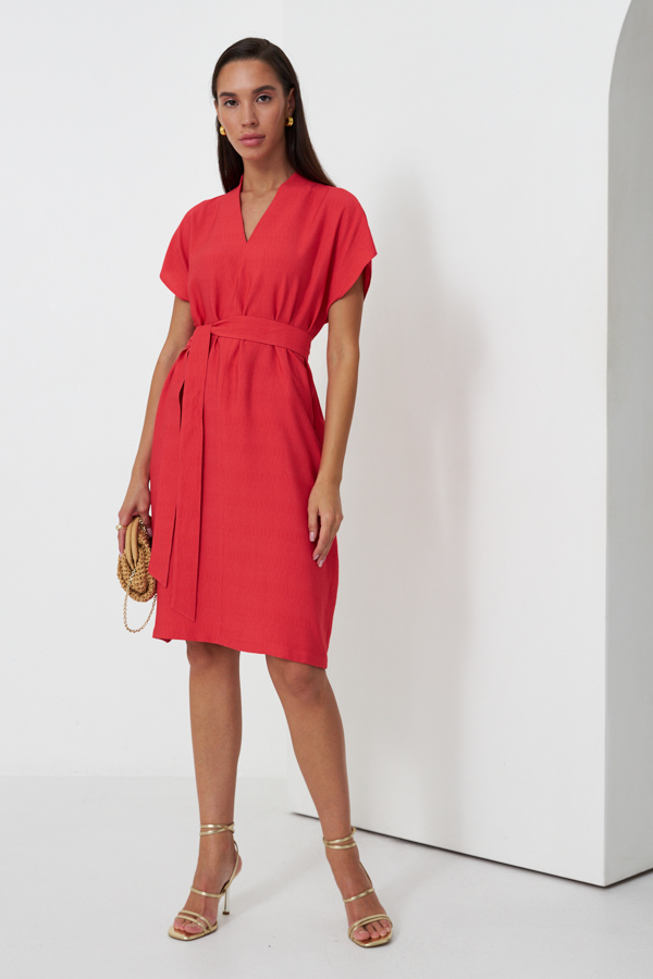 Платье из вискозной ткани с крэш-эффектом. Свободный силуэт с карманами в боковых швах. По центру передней и задней части изделия выполнен шов. Цельнокроеная стойка, переходящая в V-образный вырез горловины, визуально делает фигуру стройнее. Цельнокроеный короткий рукав. В комплекте пояс из основной ткани.