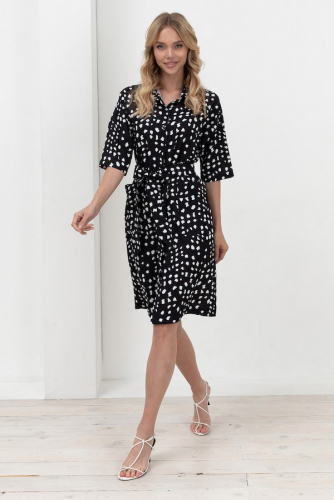 Платье из вискозной ткани с крэш-эффектом. Свободный силуэт с карманами в боковых швах. По центру передней и задней части изделия выполнен шов. Цельнокроеная стойка, переходящая в V-образный вырез горловины, визуально делает фигуру стройнее. Цельнокроеный короткий рукав. В комплекте пояс из основной ткани.