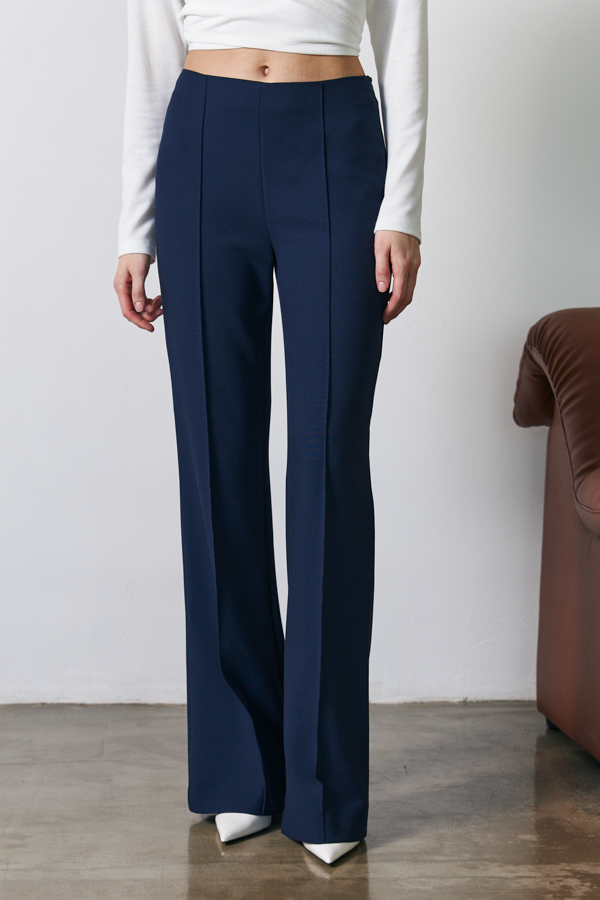 Брюки, зауженные в области колена и расклешённые книзу из костюмной ткани. На задней части брюк по талии выполнены две вытачки. На передней части застрочены стрелки. Брюки без пояса на обтачке. В боковом шве потайная молния. Низ брюк оформлен широкой подгибкой.