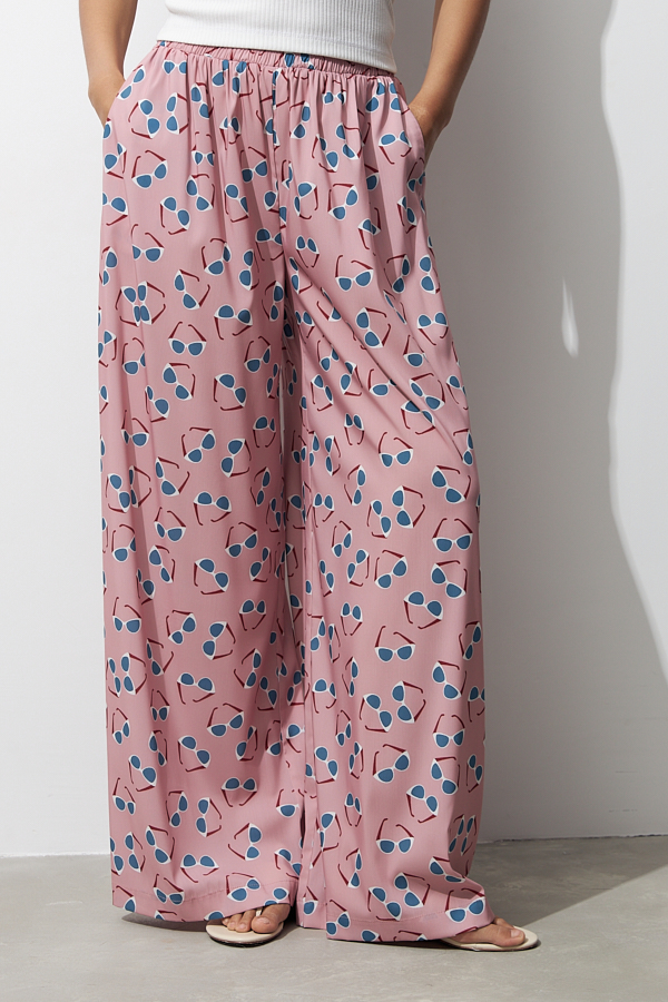 Брюки прямого свободного силуэта из вискозной ткани. Пояс притачной с эластичной резиной, в боковых швах карманы.