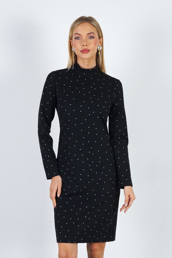 Платье из эластичного полотна с жаккардовым узором "горох". Изделие прилегающего силуэта с длинным втачным рукавом. Воротник-стойка. По среднему шву спинки застежка-молния.