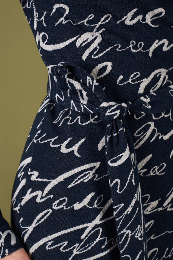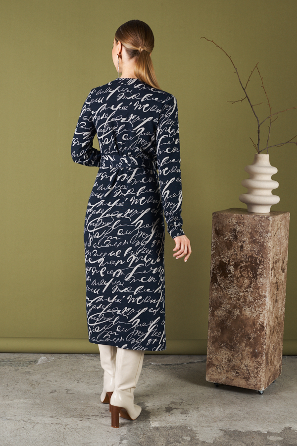 Платье прямого силуэта из мягкого эластичного полотна. Глубокий V-образный вырез горловины плавно переходит в запах, фиксируется притачным поясом. Втачной длинный рукав.