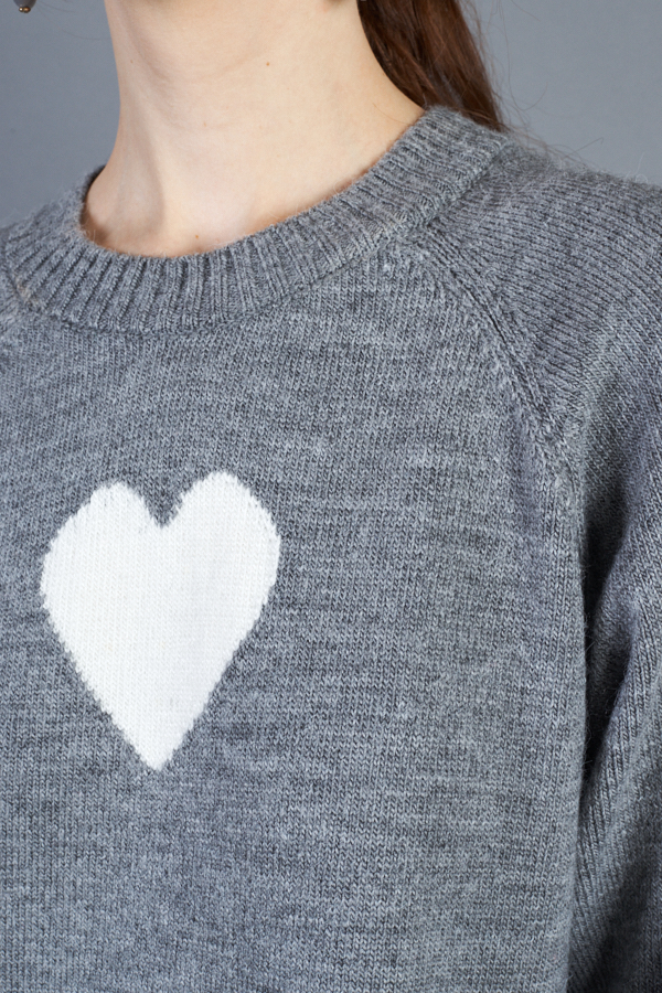 Джемпер свободного силуэта с узором «сердце» в области груди. Низ изделия асимметричной длины (спинка удлинена относительно переда). Длинный рукав-реглан. Круглый вырез горловины, низ изделия и низ рукава оформлены резинкой. Изделие выполнено из мягкой меланжевой пряжи.