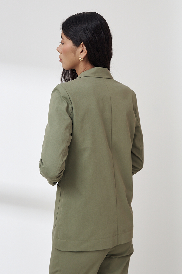 Жакет прямого силуэта с английским воротником из хлопковой ткани. На передней части жакета застежка на пуговицу и накладные карманы. Втачной длинный рукав. Изделие имеет четкую линию плеча благодаря плечевым накладкам.