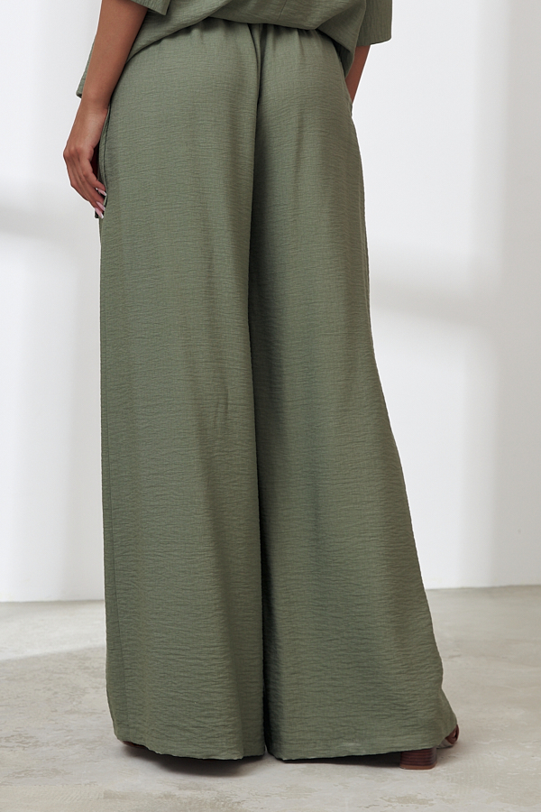 Брюки прямого свободного силуэта из вискозной ткани с крэш-эффектом. Пояс притачной с эластичной резиной, в боковых швах карманы.