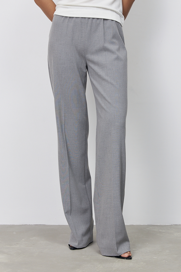 Брюки прямого силуэта из костюмной ткани. Пояс притачной с эластичной резиной.