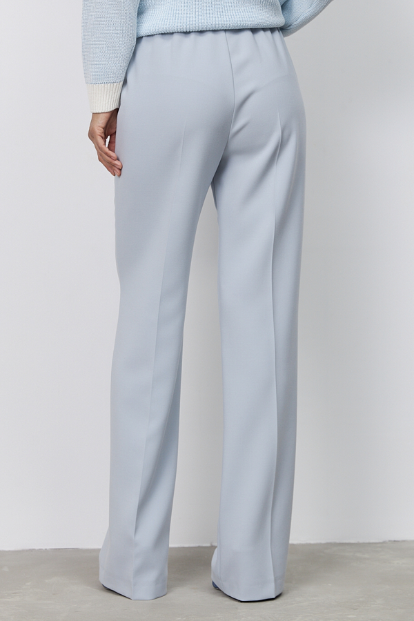 Брюки прямого силуэта из костюмной ткани. Пояс притачной с эластичной резиной.