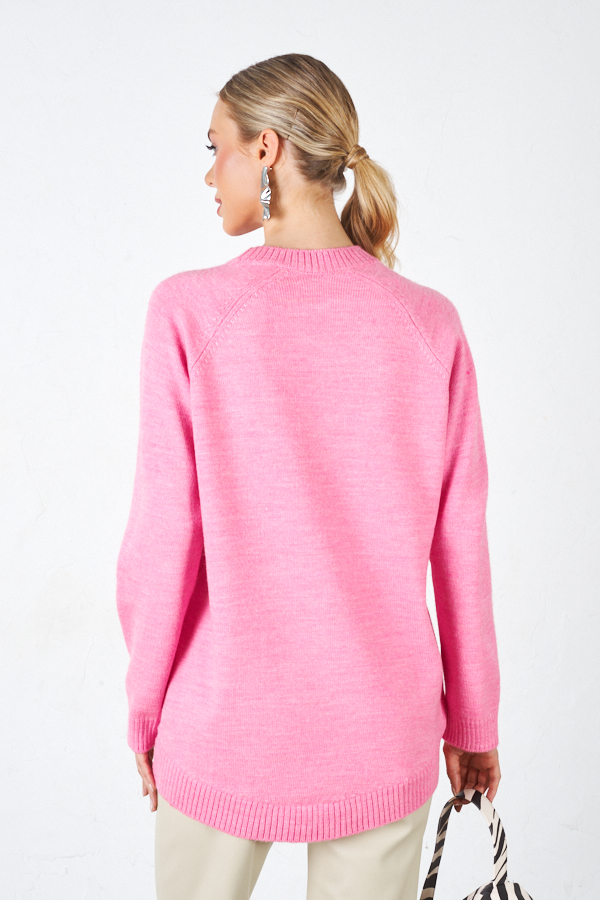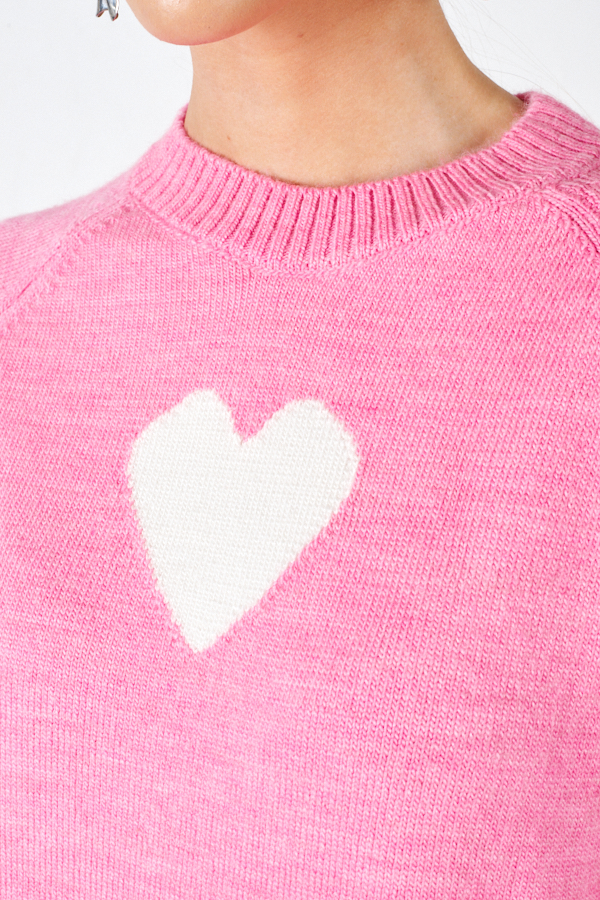 Джемпер свободного силуэта с узором «сердце» в области груди. Низ изделия асимметричной длины (спинка удлинена относительно переда). Длинный рукав-реглан. Круглый вырез горловины, низ изделия и низ рукава оформлены резинкой. Изделие выполнено из мягкой меланжевой пряжи.