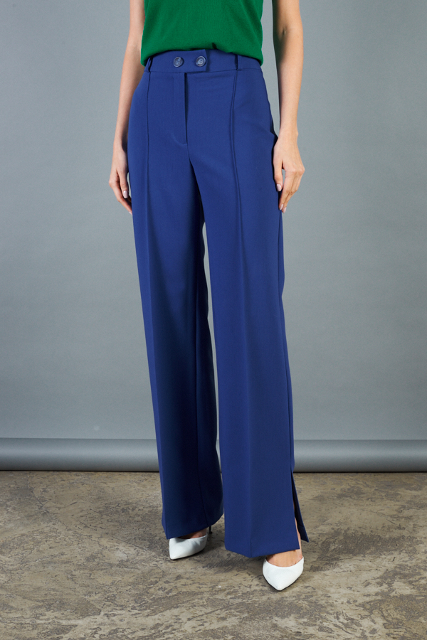 Брюки прямого силуэта, с разрезами в боковых швах из костюмной ткани. На передней части брюк застрочены стрелки. Притачной пояс со шлёвками. Застёжка на молнию-гульфик и пуговицу. Секрет такой модели кроется в безупречно точной посадке по талии и бедрам – ничего лишнего, только конструктивные детали, которые придают четкость линиям силуэта.