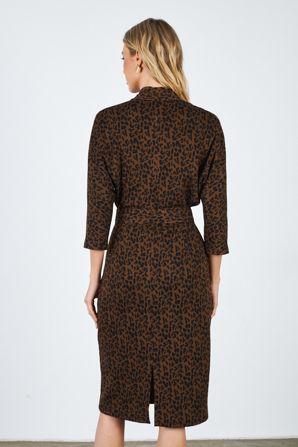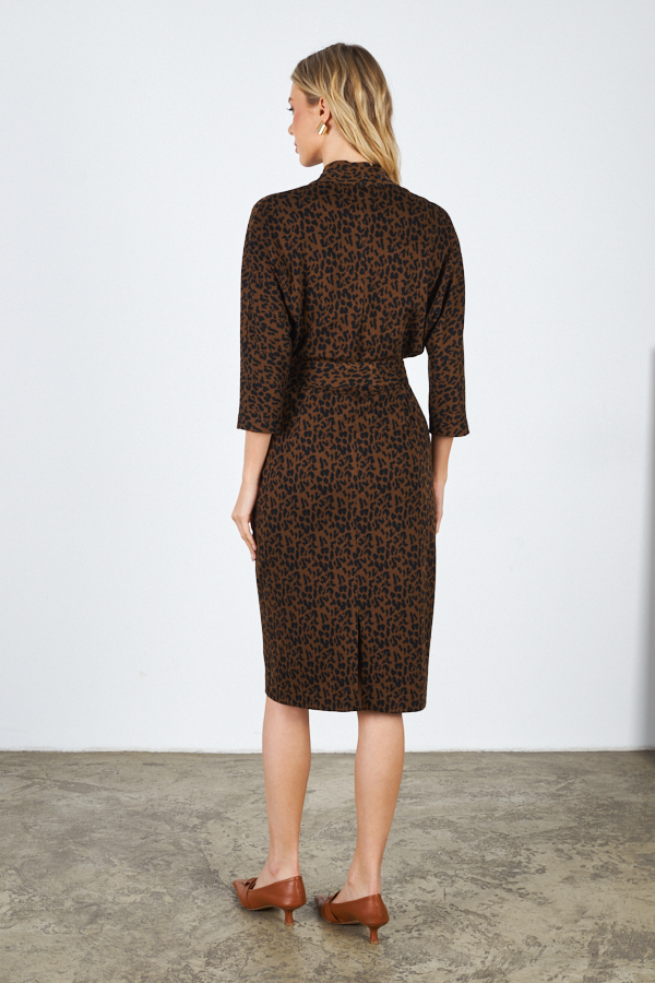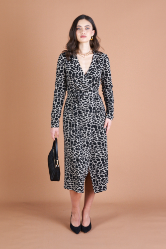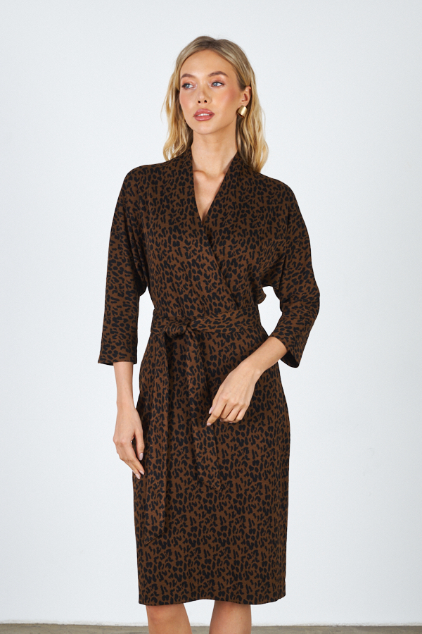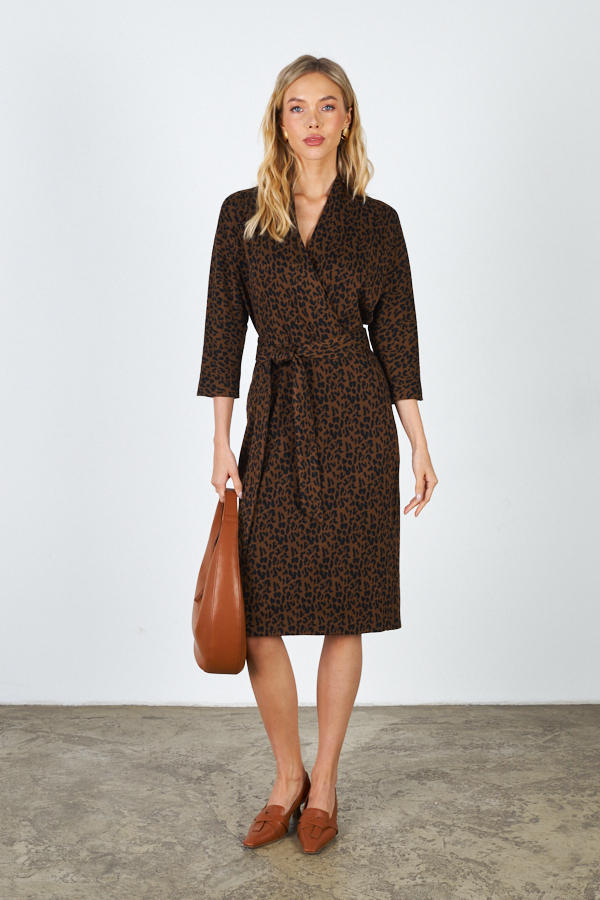 Платье из эластичного полотна с жаккардовым анималистичным узором. Изделие свободное в верхней части и прилегающее в области талии и бёдер. Лиф изделия оригинального кроя в стиле кимоно. Цельнокроеная стойка переходящая в запах, визуально делает фигуру стройнее. По центру задней части платья выполнен шов, снизу небольшой разрез. В комплекте пояс. В таблице размеров представлены параметры человека, а не изделия.