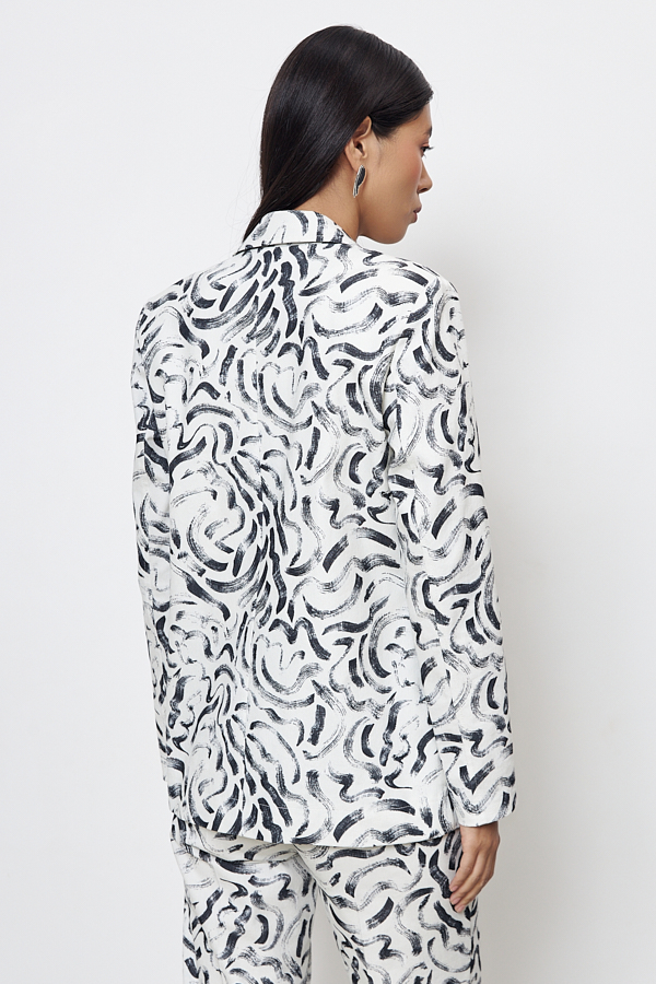 Жакет прямого силуэта с английским воротником из хлопковой ткани. На передней части жакета застежка на пуговицу и накладные карманы. Втачной длинный рукав. Изделие имеет четкую линию плеча благодаря плечевым накладкам.
