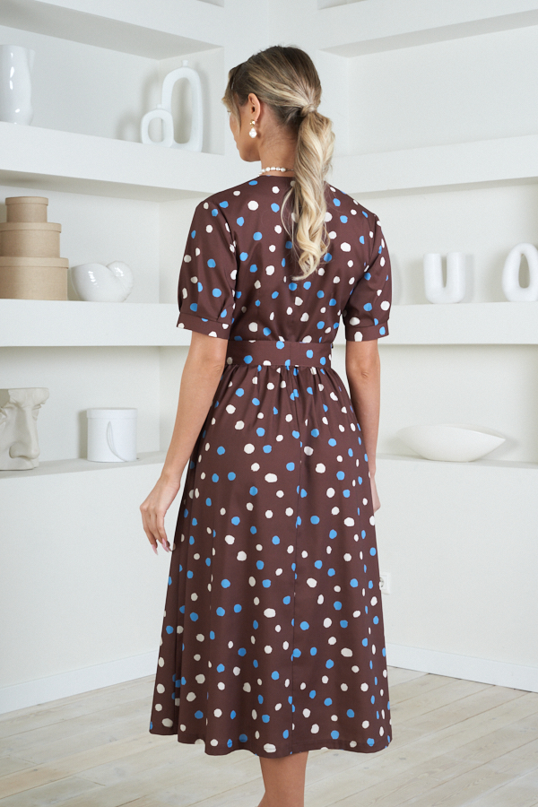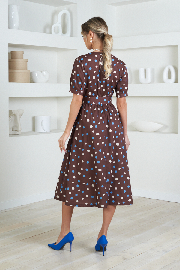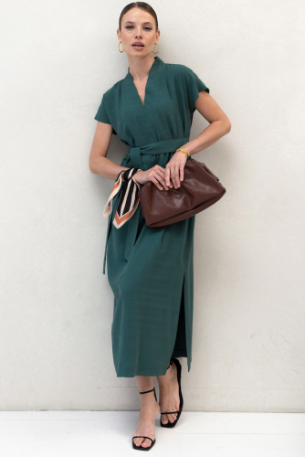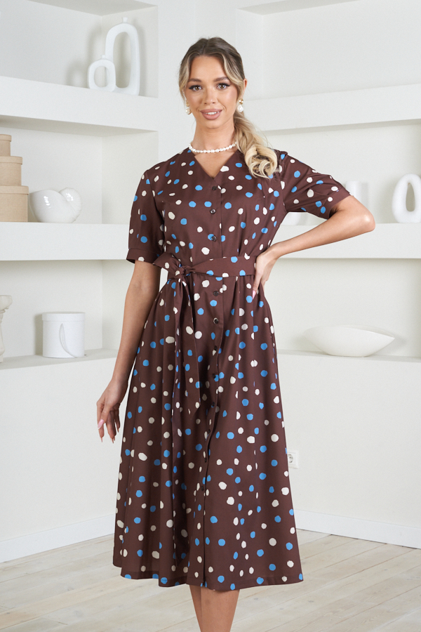 Платье из вискозной плательной ткани полуприлегающее в области груди и свободное в области бедер. Изделие отрезное по линии талии с застёжкой на пуговицы. В боковых швах карманы. V-образный вырез горловины, визуально делает фигуру стройнее. Втачной короткий рукав с защипами по низу рукава и манжетой. В комплекте пояс из основной ткани.