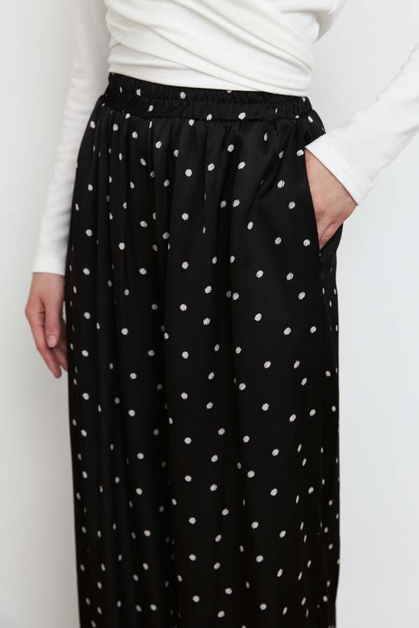 Брюки прямого свободного силуэта из вискозной ткани. Пояс притачной с эластичной резиной, в боковых швах карманы.