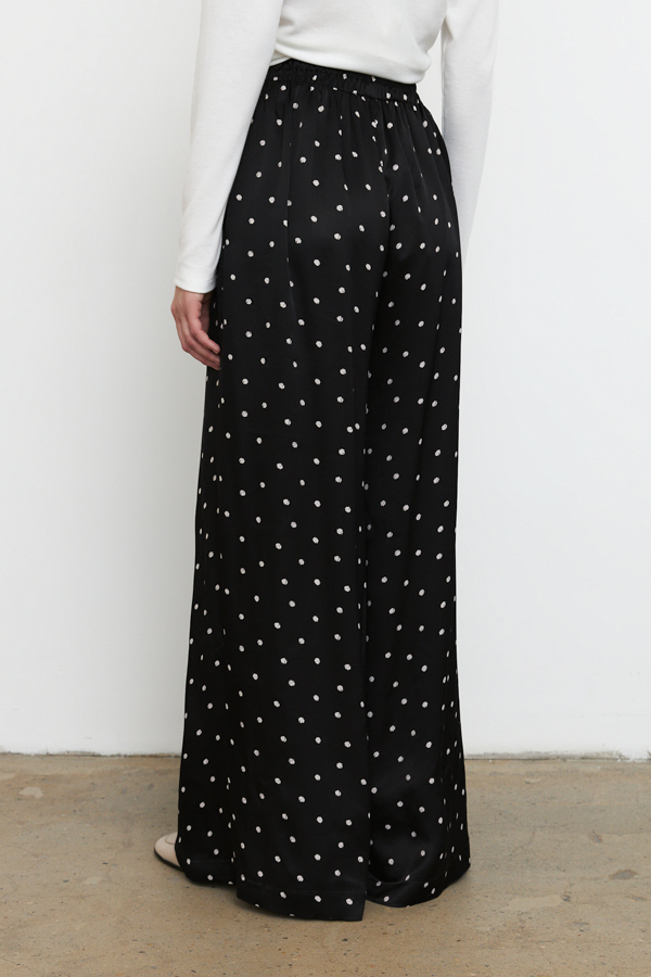 Брюки прямого свободного силуэта из вискозной ткани. Пояс притачной с эластичной резиной, в боковых швах карманы.