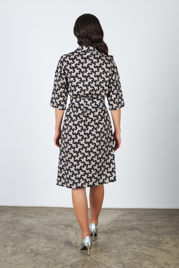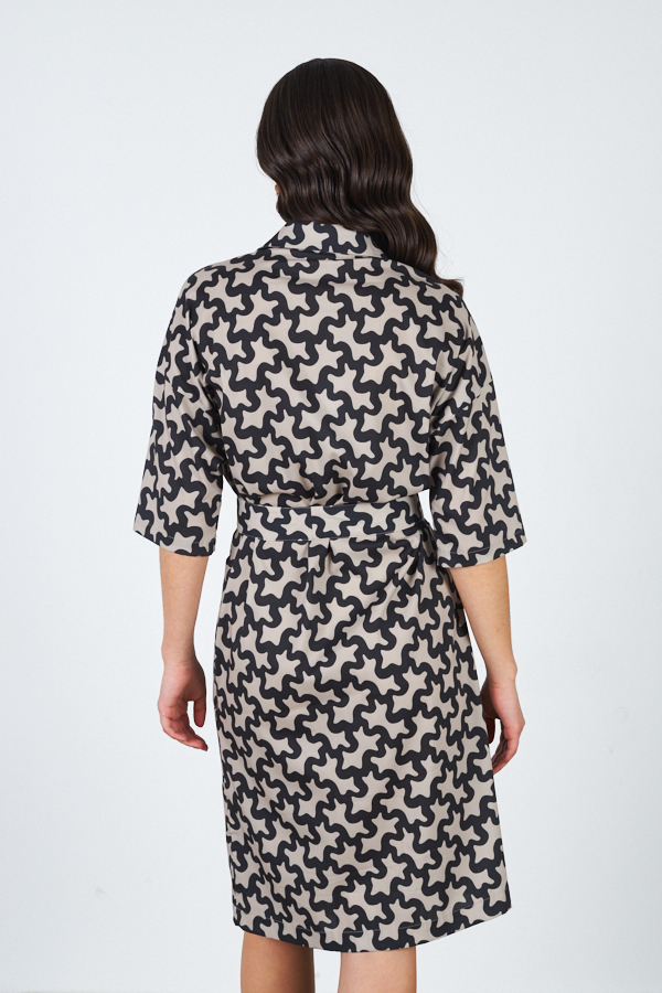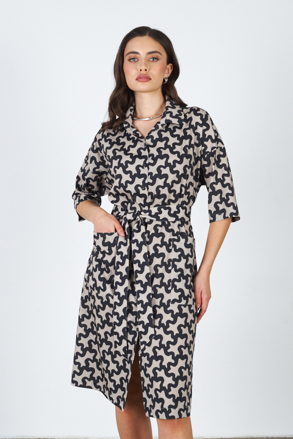Платье-рубашка свободного силуэта, с застёжкой на пуговицы из вискозной ткани. Короткий втачной рукав в спущенную пройму. Вырез горловины обработан отложным воротником на стойке. На передней части изделия выполнены накладные карманы. В комплекте пояс из основной ткани.
