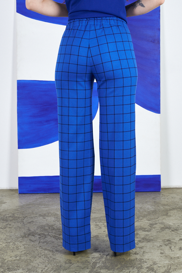 Брюки прямого силуэта из костюмной ткани. Пояс притачной с эластичной резиной.